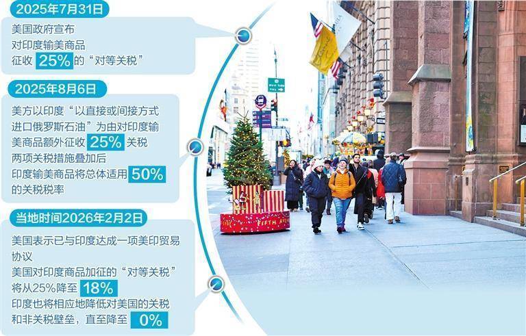 当地时间2月2日,美国总统特朗普表示,美国已与印度达成了一项贸易协议。根据协议,美国对印度商品加征的“对等关税”将从25%降至18%。印度也将相应地降低对美国的关税和非关税壁垒,直至降至零。美方还称,印度承诺将大幅增加对美国产品的采购,包括价值超过5000亿美元的美国能源、技术、农产品、煤炭以及其他许多产品。至此,美印贸易谈判历经漫长“拉扯”终于出现转机。